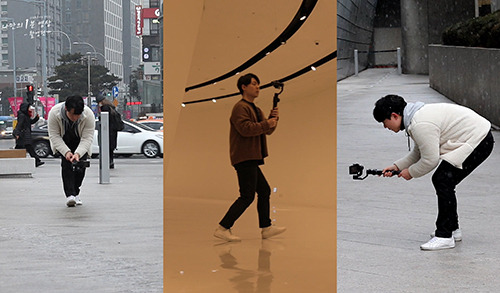 촬영방법은 간단합니다. 첫번째 방법처럼 최대한 카메라 앵글을 낮추고 촬영을 시작하시면 됩니다. 이후 이동하는 인물의 동선에 따라 대각선으로 카메라를 올리는 느낌으로 천천히 올리면 됩니다. 앵글 이동 또한 천천히 팔꿈치를 양 옆구리에 붙인 채 카메라 중앙에 인물을 배치한다는 생각으로 촬영하면 보다 안정적인 결과물이 나올 것입니다.