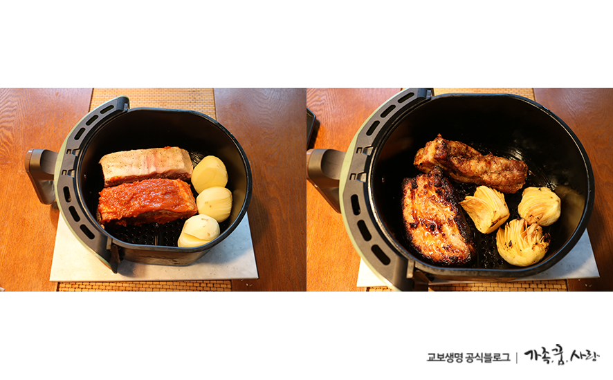 3. 에어프라이어에 통삼겹살과 감자를 넣고 180℃에서 25분을 구워 줍니다. 25분이 지나면 고기와 감자를 뒤집어서 10분을 더 구워 주는데요, 에어프라이어의 출력과 개인의 취향에 따라 조리 시간을 가감해 주세요. 바삭한 고기의 식감을 원하는 분은 마지막 2~3분이 남았을 때 고기를 슬라이스로 잘라 구워 주시면 됩니다.