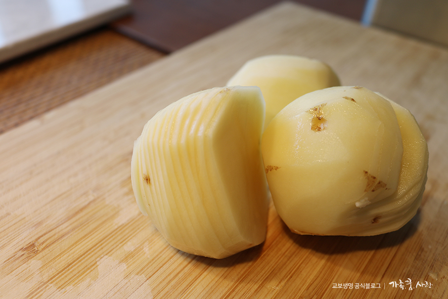 2. 감자는 깨끗이 씻어 껍질을 벗겨 줍니다. 얇게 슬라이스 하되 끝까지 자르지 말고 칼집을 넣어 준다는 느낌으로 끝만 살짝 남기고 잘라 주세요. 버터 또는 올리브 오일을 뿌린 후, 허브솔트를 간을 해줍니다. 취향에 따라 치즈 등을 뿌려 주셔도 좋아요.