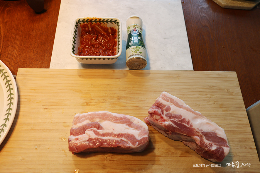 1. 통 삼겹살은 네모 모양으로 반듯하게 자른 한 근을 준비해 주세요. 너무 크면 에어프라이어의 크기에 맞춰 잘라 줍니다. 삼겹살 위에 취향에 맞게 허브솔트를 뿌리거나 쌈장을 발라 주시되, 쌈장은 많이 바르면 탈 수 있으니 살짝 얇게 발라 주세요.