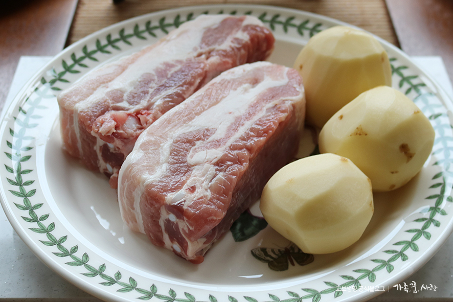 4. 잘 익은 감자와 통삼겹살을 먹기 좋게 잘라 접시에 담아 주면 완성입니다!