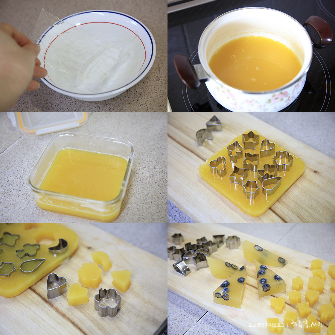 6. 같은 방법으로 젤리를 만든 후 이번에는 모양틀을 이용해 한입에 쏙 먹기 좋게 잘라 보세요. 저는 오렌지주스 100ml에 물에 불린 판젤리 8장을 넣어 과일 없는 여러 모양 젤리와 블루베리만 넣은 삼각형 모양 젤리를 추가로 만들어 보았습니다.