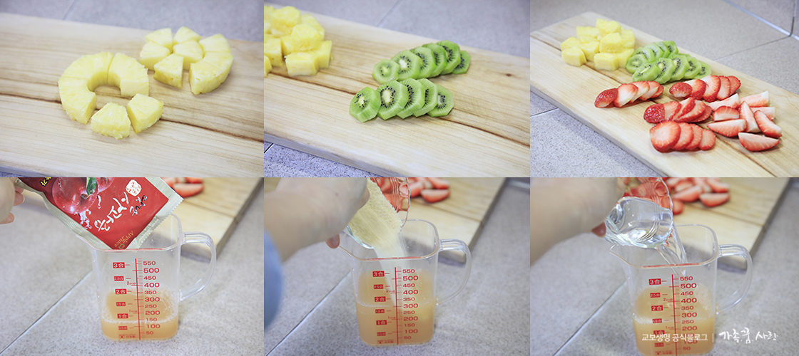 준비 재료: 딸기 6~7개, 파인애플 2조각, 키위 2개, 판젤라틴, 사과즙 2봉지, 설탕 3스푼, 물 20ml