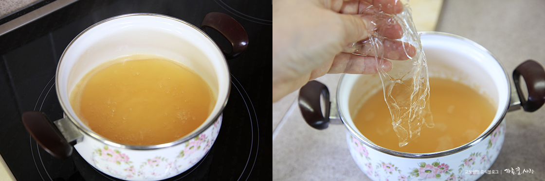 3. 용액을 냄비에 넣고 기포가 올라오기 전까지 바르르 끓이고 한 김 식혀 주세요. 용액이 식으면 부드럽게 변한 판젤라틴을 물기를 꼭 짠 후 넣어 줍니다. 사과즙과 물을 섞은 용액 200ml를 기본으로 할 때 판젤라틴 12장, 약 20g을 넣으면 적당한 것 같아요.