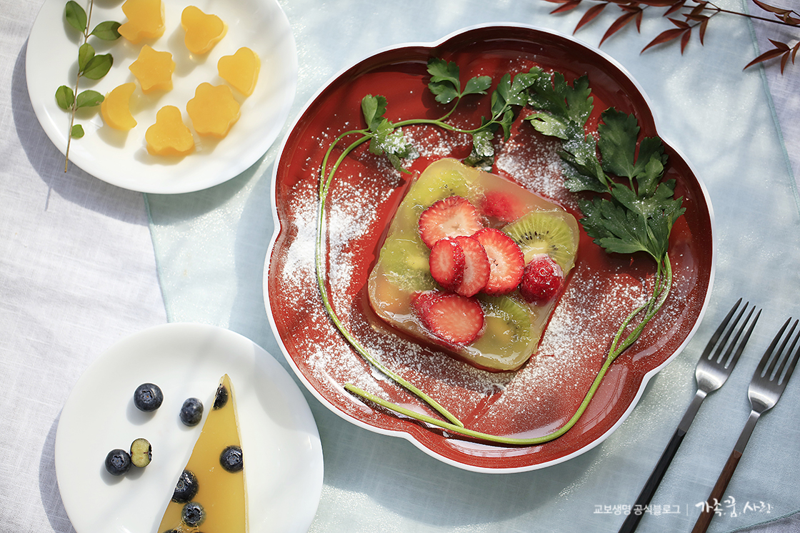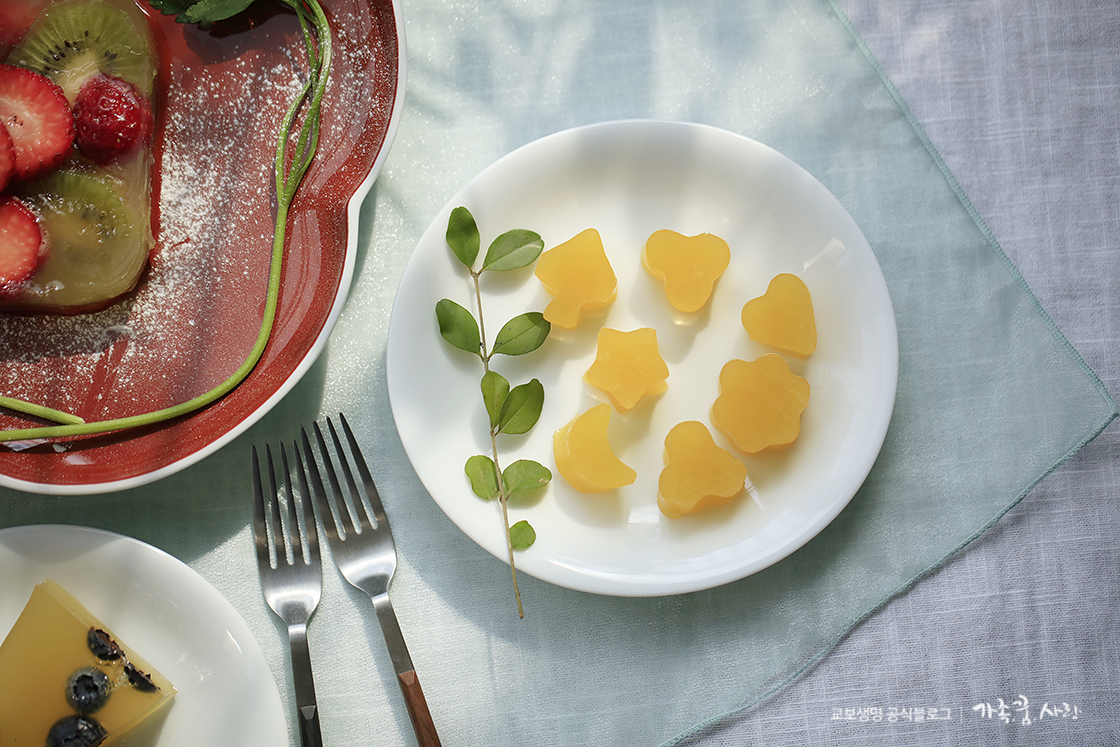 코로나19로 아이들 개학이 늦어지고 외출도 자제하면서 격리 아닌 격리 생활을 하고 있는 요즘, 가족들의 하루 세 끼와 더불어 틈틈이 간식까지 챙겨야 하는 엄마들은 그 어느 때보다 바쁜 나날을 보내고 있는데요, 오늘은 아이들이 좋아하는 과일로 탱탱하고 쫄깃한 식감이 일품인 젤리를 만들어 보려고 합니다. 아이들과 함께 과일을 고르고 모양틀로 예쁜 모양을 만들며 시간을 보내다 보면, 어느새 달콤한 젤리가 완성되어 있을 거예요. 집에서 생과일로 만들어 안심하고 먹을 수 있는 건강한 젤리, 지금부터 만들어 볼게요!