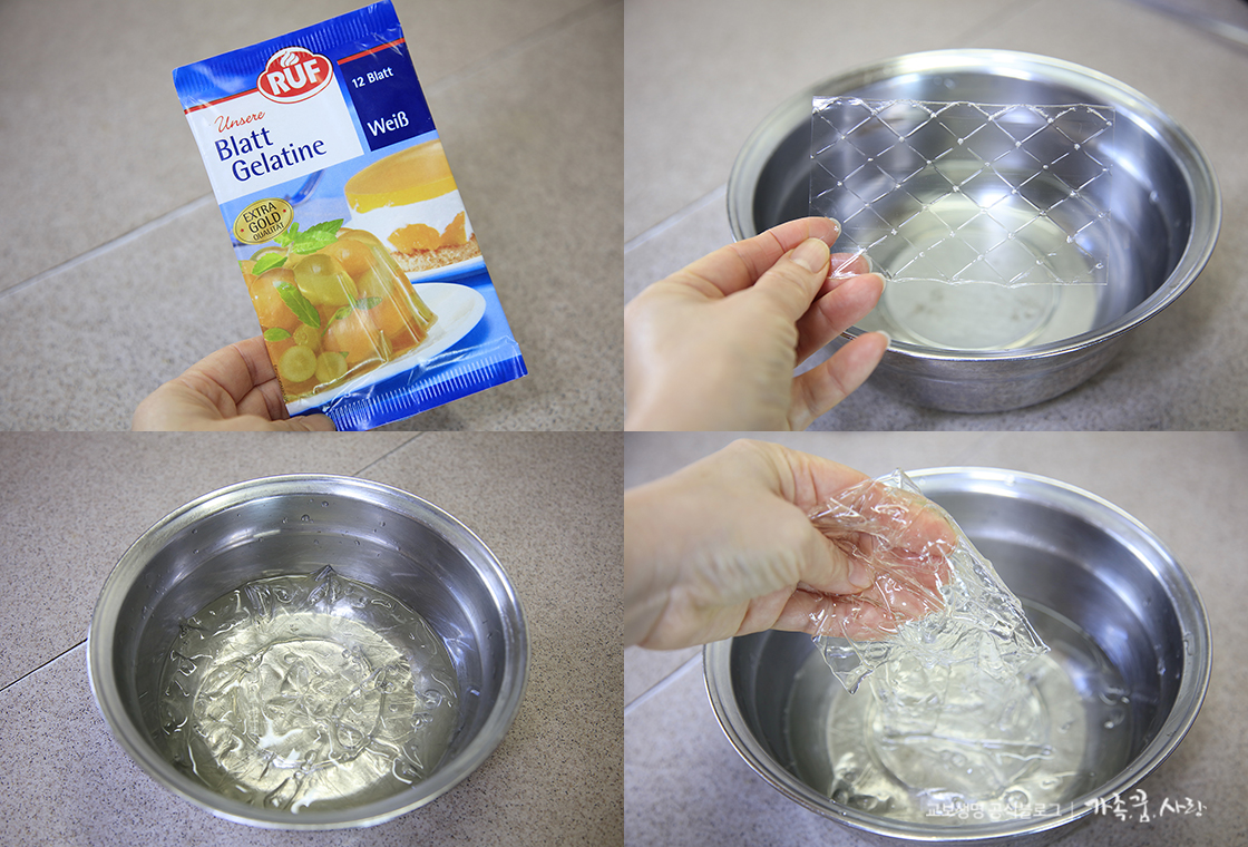 1. 젤라틴은 형태에 따라 판젤라틴과 가루젤라틴으로 나뉘는데요, 판젤라틴의 사용법이 가루보다 쉽고 간단해서 집에서 만들 때는 판젤라틴을 사용하시는 것을 추천합니다. 판젤라틴 한 봉지에는 모두 12장의 판젤라틴이 들어 있는데, 딱딱한 판젤라틴을 한 장씩 달라붙지 않게 모두 찬물에 넣어 20분간 불려 주세요. 이 과정을 해야 젤라틴이 녹는 과정에서 냄새가 나지 않습니다. (젤라틴은 동물의 연골이나 뼈 등의 성분이 들어 있기 때문에 녹는 과정에서 안 좋은 냄새가 날 수도 있어요)