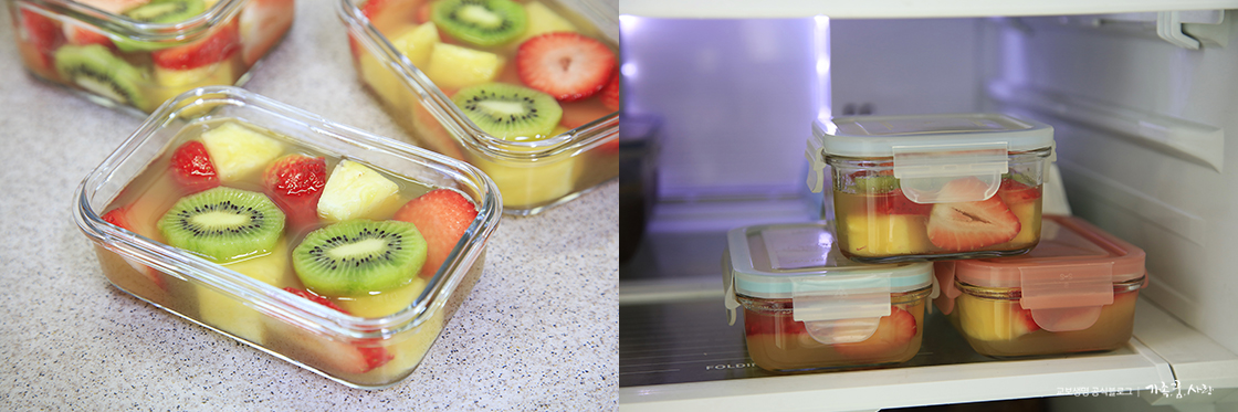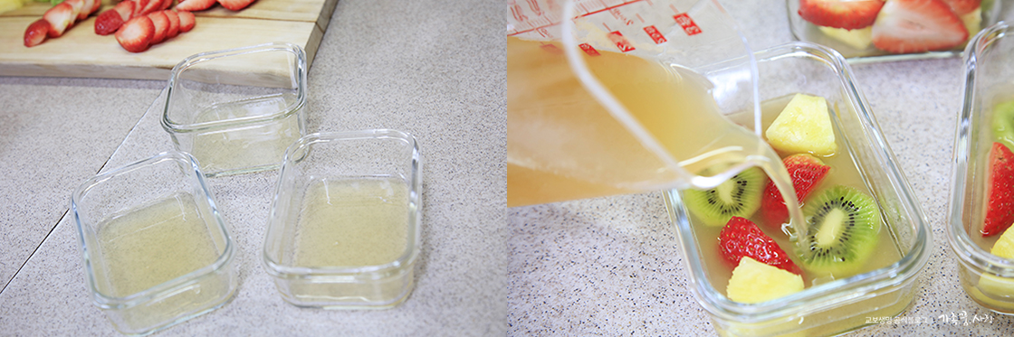 4. 그릇에 젤라틴 녹인 용액을 바닥에 깔릴 정도로만 넣은 후, 썰어 둔 과일을 넣고 그 위에 다시 용액을 넣어 줍니다.