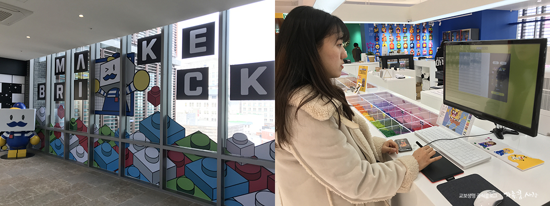 5층에는 다양한 브릭 아트를 즐길 수 있는 체험 공간인 메이크 브릭이 있습니다. 사진을 찍어서 포토 브릭을 만들 수도 있고, 색연필과 컴퓨터를 이용한 색 채우기 체험도 할 수 있어요.