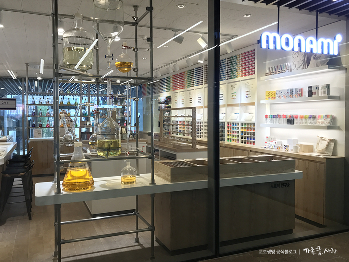 고잉메리에서 나오면 앞쪽에 모나미가 보입니다. ‘국민 볼펜’이라는 별명이 있는 모나미의 다양한 필기구를 구경할 수 있는데요, 필기구에 관심이 많고 다이어리 꾸미기를 좋아하는 분들이라면 꼭 들러야 할 필수 코스입니다.