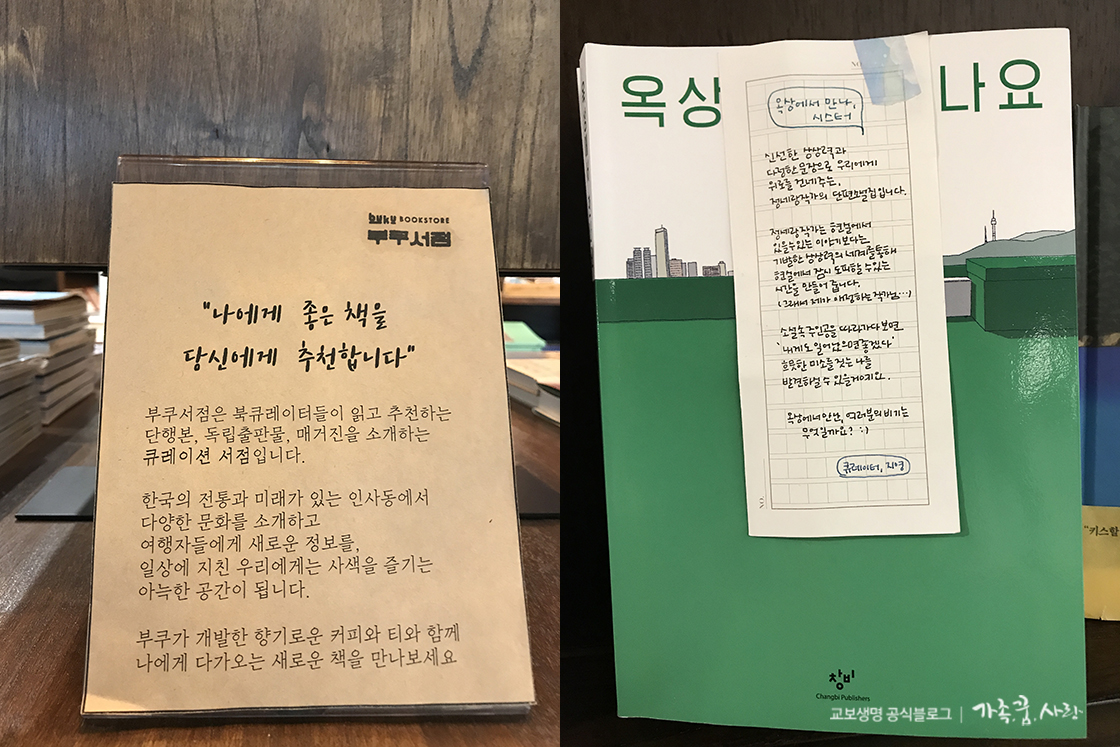 4층에 위치한 부쿠서점은 큐레이터가 직접 책을 읽고 좋은 책을 소개해 주는 큐레이션 서점입니다. 큐레이터의 코멘트가 책 표지에 붙어 있어서 미리 책 내용을 짐작해 볼 수 있죠.