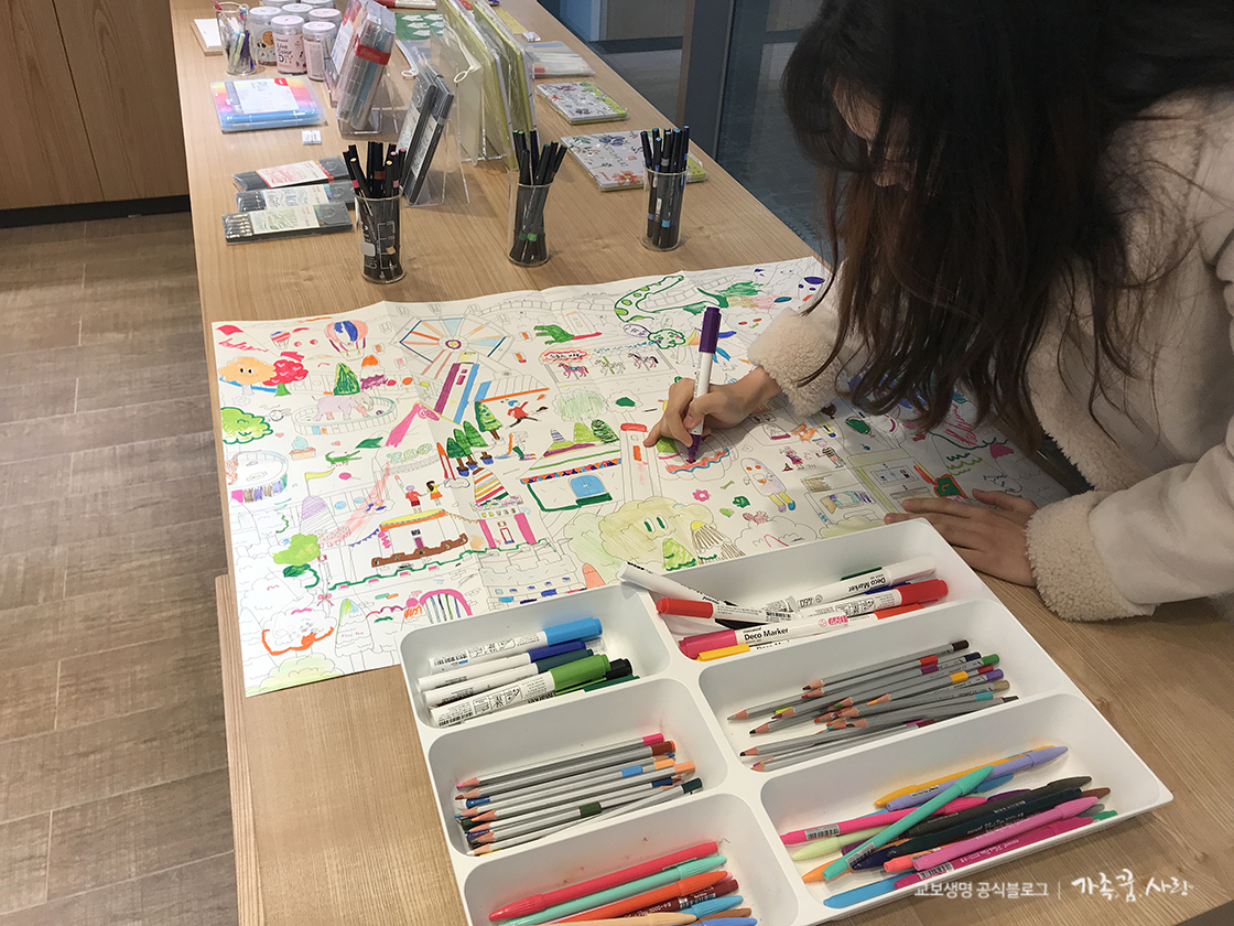 한 쪽에서는 색연필, 마커 등을 이용해서 그림을 색칠해 볼 수도 있었어요. 마치 어린아이로 돌아간 듯한 기분을 느낄 수 있었습니다.