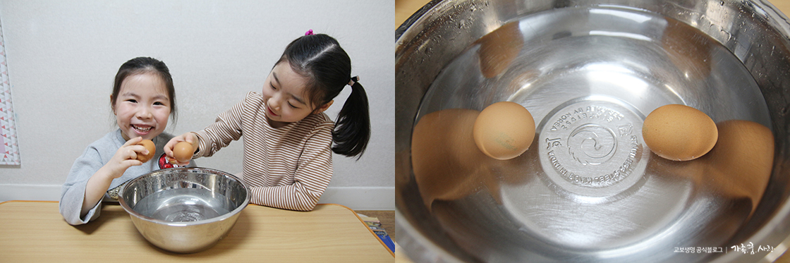 설탕물 무지개층을 만들기에 앞서 계란을 물에 띄우는 간단한 실험을 먼저 해 봤습니다. 제가 “계란은 물에서 뜰까? 소금물에서 뜰까?”라는 질문을 던지자 아이들은 저마다 다른 대답을 내놓았어요.