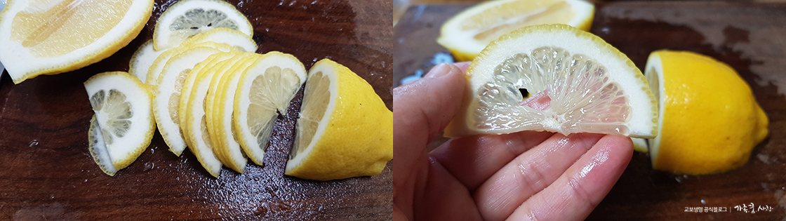 2. 레몬은 반달 모양으로 투명하게 비칠 정도로 얇게 썰어 주세요. 레몬 씨는 쓴 맛이 나기 때문에 제거해야 합니다.