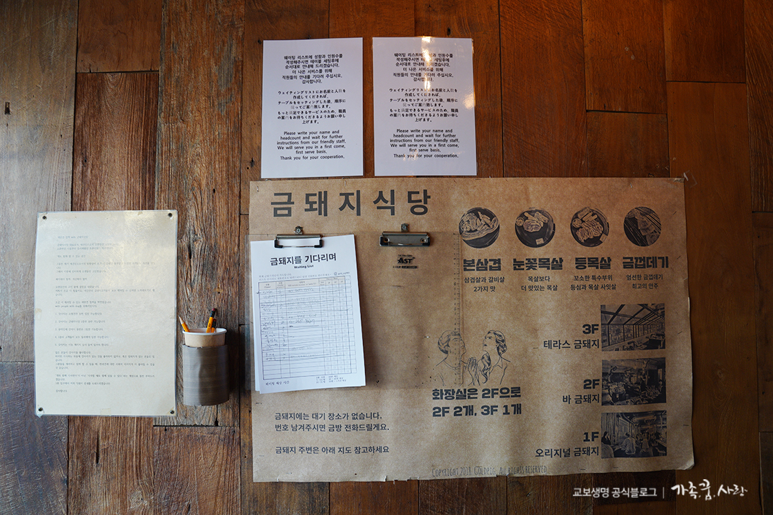 1층뿐만 아니라 2, 3층까지 운영하고 있는 금돼지식당. 1층은 정오부터 새벽 1시까지, 카운터(바)로 꾸민 2층과 테라스 느낌이 나는 3층은 오후 5시 30분부터 저녁 10시 30분까지 운영한다고 합니다. 층별로 다른 분위기를 느끼며 맛있는 고기를 즐길 수 있으니 취향에 맞게 금돼지 식당을 즐겨보시는 건 어떨까요?