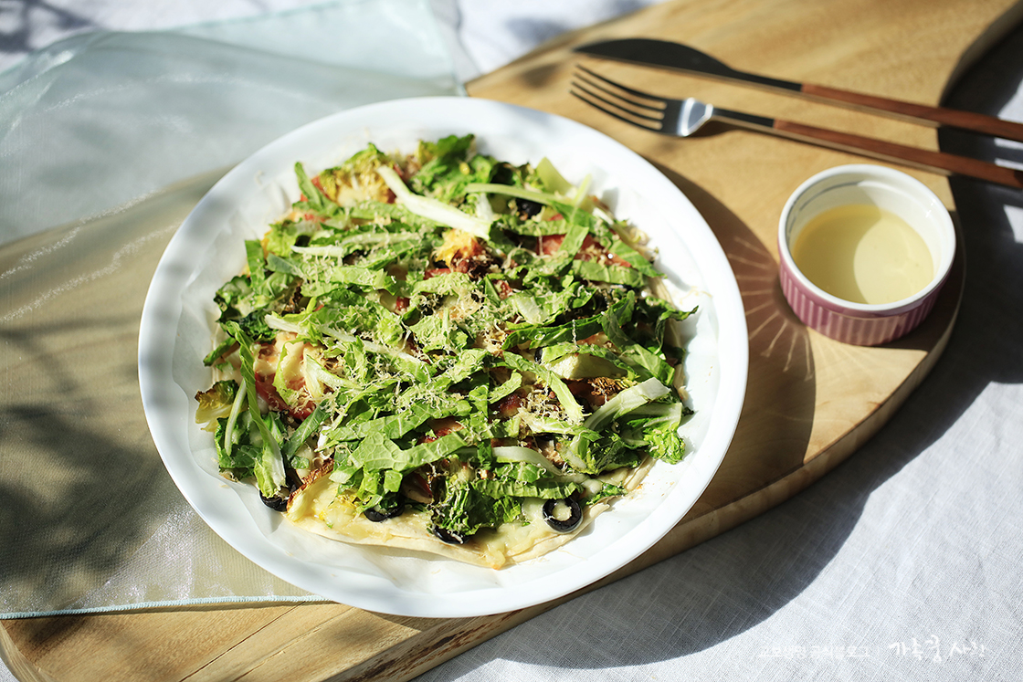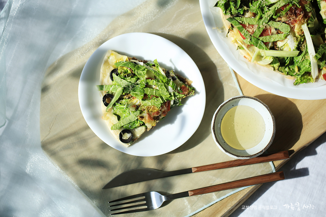 야채를 별로 좋아하지 않는 아이들이 잘 먹을지 걱정했는데, 다행히 잘 먹으며 앞으로 피자 시켜 먹을 필요 없다고 하네요. 제철 식재료 만큼 몸에 좋은 보약은 없지요. 겨우내 추위를 견디고 나오는 봄나물은 땅의 영양분을 그대로 머금고 있어 그 자체만으로도 좋은 영양소라고 합니다. 또띠아로 간편하게 만들 수 있는 피자에 봄동만 더해 성큼 다가온 봄을 만끽해 보세요!