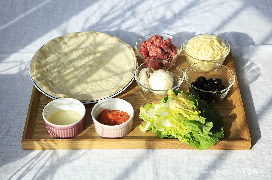 준비 재료: 봄동 8장, 또띠아 2장, 소고기 다짐육 120g, 모차렐라 피자치즈 110g, 양송이버섯 3개, 올리브 6개, 꿀 2스푼, 피자소스 1스푼, 토마토 1개