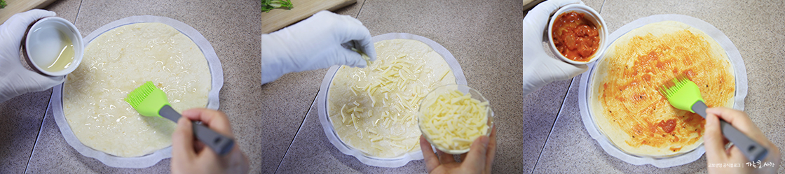 3. 또띠아 1장 위에 꿀을 바르고 피자치즈를 살짝 뿌려 주세요. 그 위에 다시 또띠아 1장을 올리고, 피자소스 1스푼 정도를 발라 줍니다. (스파게티 소스도 괜찮아요. 짜지 않게 살짝만 발라 주세요)