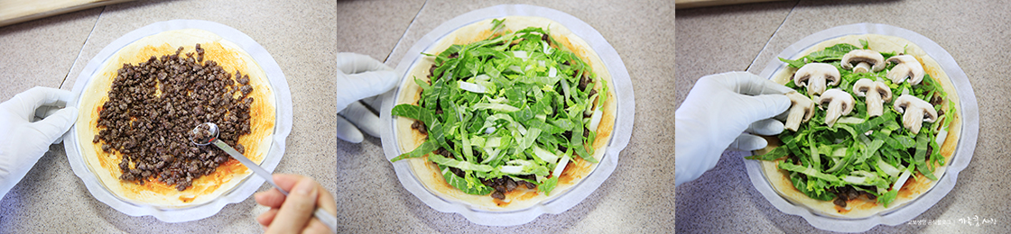 4. 그 위에 볶은 소고기 다짐육을 올리고 채 썬 봄동을 듬뿍 올린 후 양송이버섯을 토핑해 주세요.