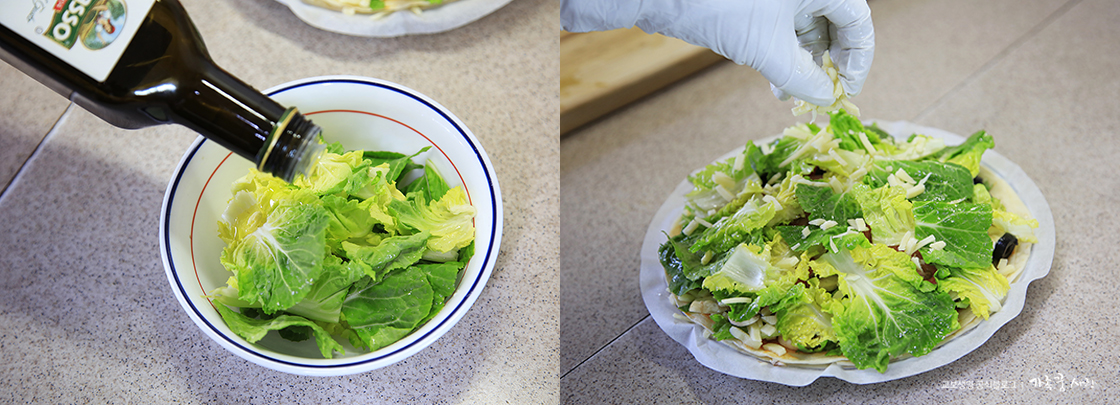 6. 마지막으로 봄동의 속잎을 올리브유로 살짝 버무려 올리고 다시 한번 피자치즈를 솔솔 뿌려 줍니다(토핑으로 올리는 채소는 올리브유로 코팅을 해 두면 마르지 않고, 구워졌을 때도 바삭하고 맛있어요).