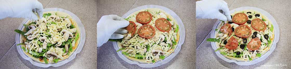 7. 토핑이 끝난 또띠야는 오븐에 넣고 구워 주세요. 저는 예열 시간까지 모두 합쳐 160℃에서 10분 구웠는데, 오븐마다 출력이 다르니 세기와 시간은 조절하셔야 합니다.