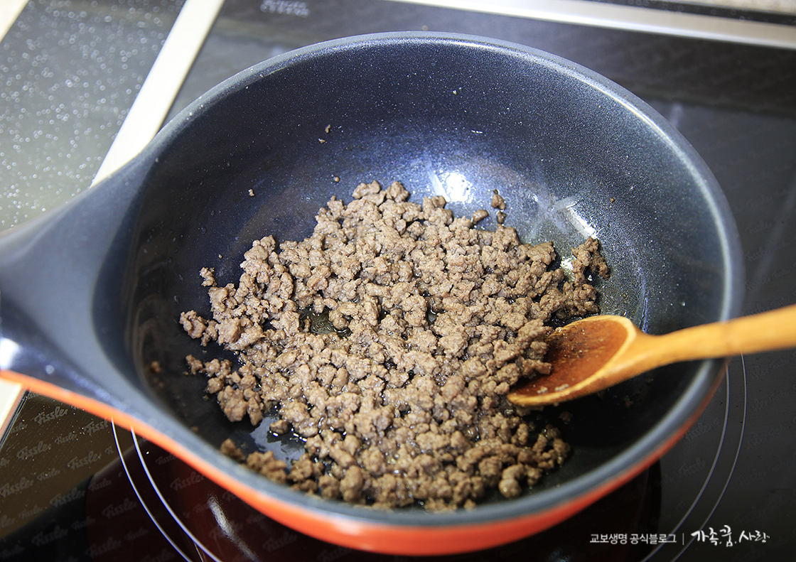 2. 소고기 다짐육은 청주, 미림, 갈릭솔트로 밑간 한 후 기름을 살짝 넣고 달달 볶아 주세요.