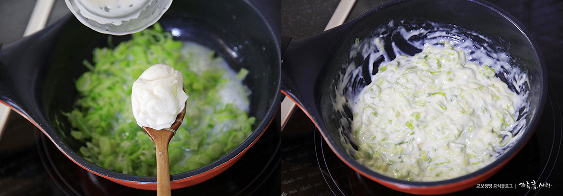 2. 대파가 노릇노릇 볶아지면 연유, 마요네즈, 크림치즈를 넣고 잘 섞어 주세요. 맛을 보고 기호에 맞게 설탕, 소금으로 모자란 간을 맞춰 줍니다.