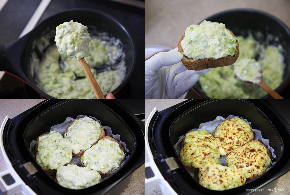 3. 숟가락으로 떴을 때 흘러내리지 않을 정도의 묽기로 소스가 완성되면 바게트빵 위에 아낌없이 듬뿍 올려 에어프라이어 180℃에서 10분 정도 구워 줍니다. 집집마다 에어프라이어의 출력이 다르니 중간에 구워지는 정도를 확인해 보시고 시간은 조절하세요.