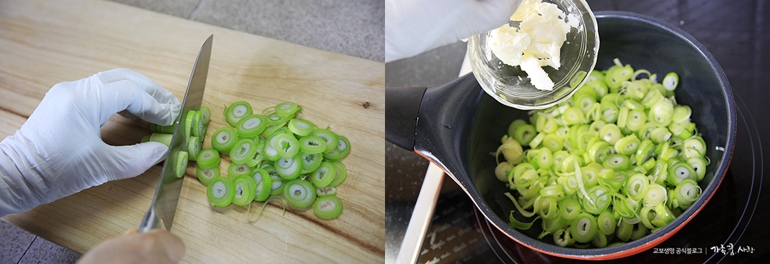 1. 대파 1대를 씻은 다음 뿌리만 제거하고 송송 썰어 주세요. 냄비에 버터를 0.5스푼 넣고 녹여 줍니다. 버터 향이 퍼지면 썰어 둔 대파를 넣고 볶다가 나머지 버터를 마저 넣고 타지 않게 살살 저어 주세요.