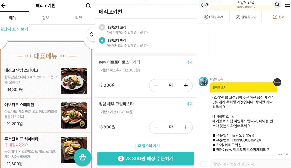 로봇이 서빙하는 식당답게 주문도 비대면으로 합니다. 테이블에 안내되어 있는 QR코드를 찍으면 배달의 민족 앱이 자동으로 실행되는데요, 메뉴를 선택하고 결제하기 버튼만 누르면 끝입니다. 스테이크, 샐러드, 파스타, 라자냐와 같은 다양한 양식 메뉴들이 있는데, 전 파스타를 주문해 봤어요.