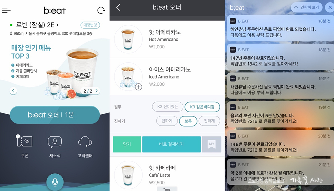 ‘비트커피’ 앱을 다운 받아 원두의 종류와 진하기, 시럽의 양 등을 입맛대로 선택해 주문하면 음료 진행 과정이 푸시 알람으로 계속 전달됩니다. 내가 주문한 커피가 완성되기까지 몇 분이 남았는지는 물론, 커피 완성 알림, 커피 픽업을 완료한 시간까지 정확하게 확인할 수 있죠.
