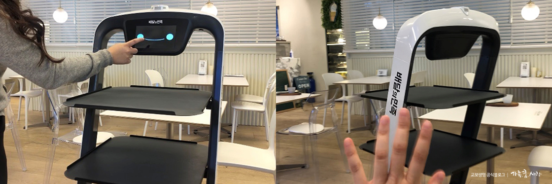 파스타를 든 딜리가 행여나 우리 테이블을 지나칠까 조마조마했는데, 정확하게 테이블 앞에 딱 멈춰 섰습니다. 테이블 번호에 맞춰 미리 세팅된 위치로만 움직인다고 해요. 딜리가 싣고 온 음식을 테이블로 옮긴 후 완료 버튼을 누르면 딜리가 싱긋 웃어 주고 돌아갑니다. 잘 가, 딜리야!