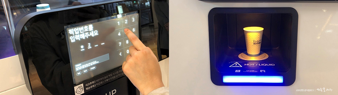 커피가 완성되면 내 폰으로 픽업 번호가 도착합니다. 기계에 번호를 입력하면 출구가 열리고, 안에서 로빈이 만든 커피를 꺼낼 수 있어요. 일정 시간이 지나도록 음료를 픽업하지 않으면 음료가 폐기될 수 있으니 주의해야 합니다.