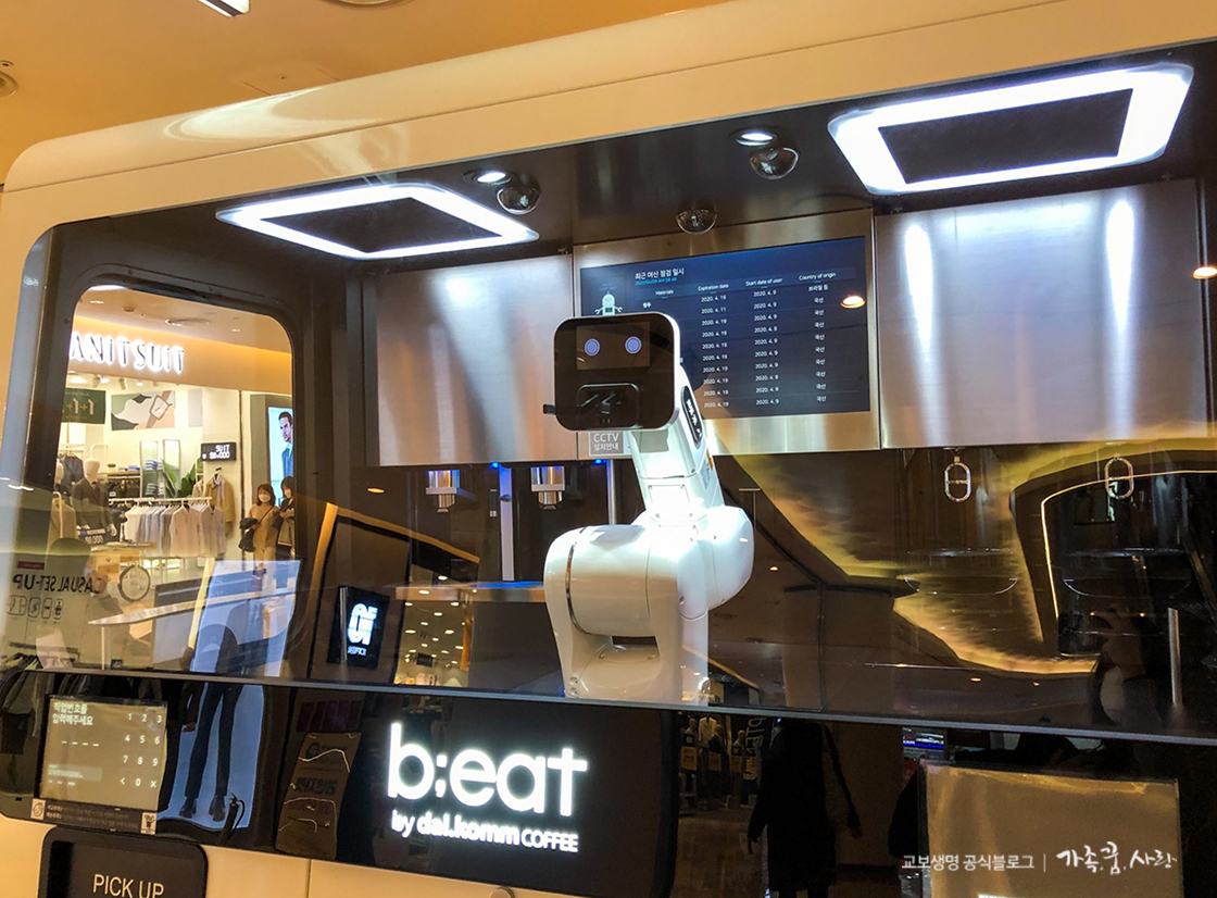 밥을 먹었으니 이제 커피를 마시러 가 볼까요? 제가 방문한 비트(b;eat)는 2018년 초, 커피 브랜드 달콤커피가 오픈한 로봇카페입니다. 로봇 바리스타인 ‘로빈’이 직접 커피를 만들어 주는 곳으로, 제가 방문한 곳은 잠실점이지만 이외에도 여러 곳에 매장이 있습니다. 주문 방법은 크게 두 가지인데요, 하나는 키오스크를 이용하는 방법이고, 다른 하나는 앱을 이용해 주문하는 방법입니다. 저는 앱을 이용해 주문해 봤어요.