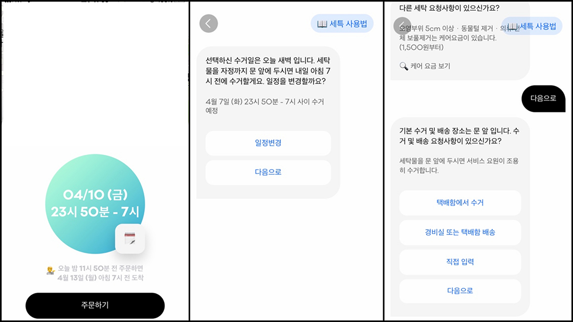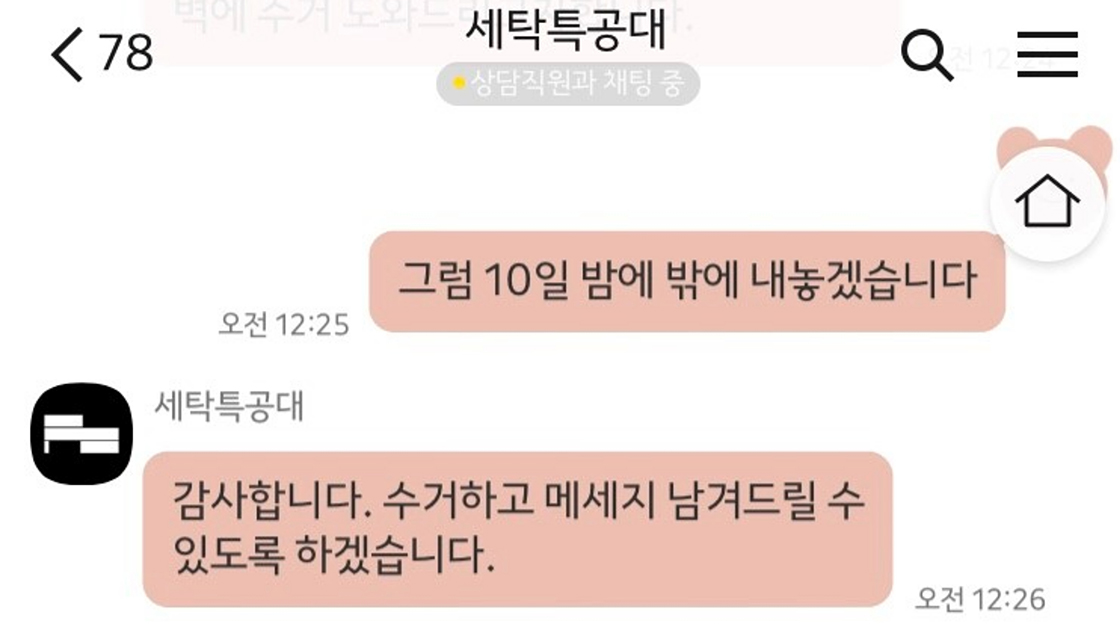 추가 세탁을 원하는 부분의 사진을 업체에 보내니 다시 한 번 꼼꼼하게 작업을 해 주겠다는 답변이 돌아왔어요. 비대면이라는 점이 편리하긴 하지만 ‘문제가 생겼을 때 소통이 제대로 될까?’ 하는 의문이 있었는데, 직접 사용해 보니 상담원 서비스가 굉장히 잘 되어 있어 불편함이 전혀 없었습니다. 자정이 넘은 시간임에도 질문하면 평균 3분 이내에 답변이 도착했어요. 비대면으로 세탁물을 맡기고 찾을 수 있다는 것도 좋았지만, 문제가 생겨도 실시간으로 상담원과 바로 소통할 수 있다는 점이 더욱 매력적이었습니다.
