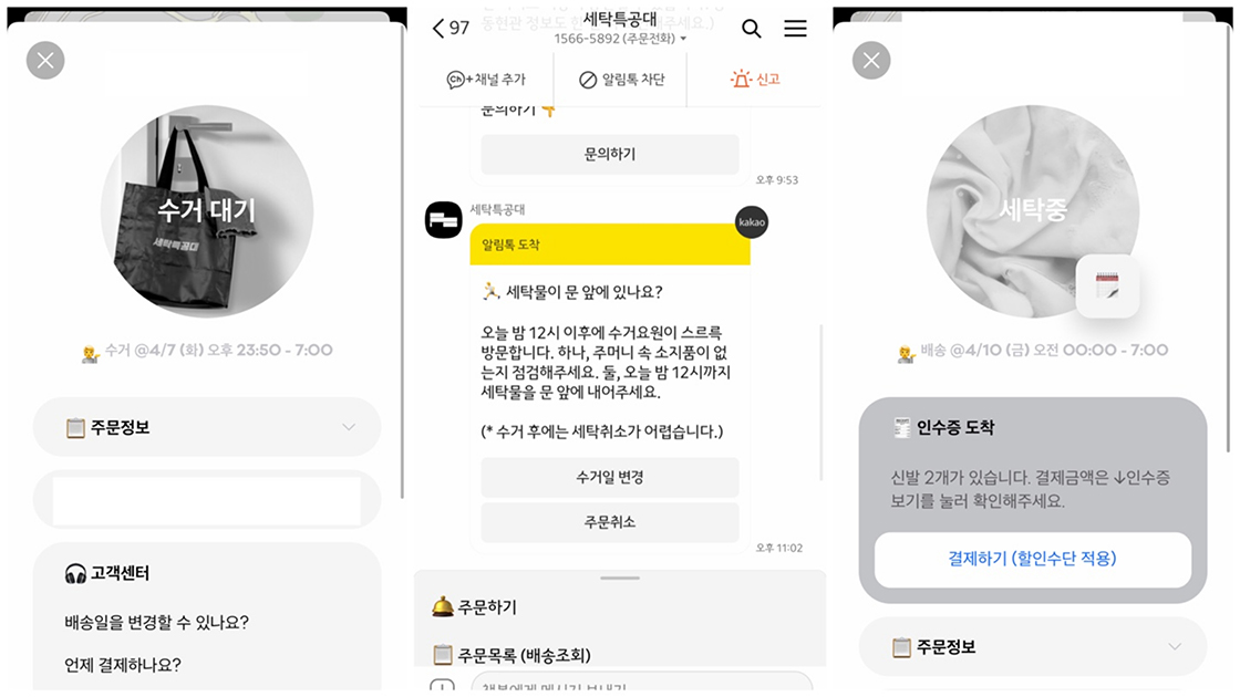 그래서 요즘엔 비대면 세탁 서비스 업체가 늘고 있는데요, 저는 그 중에서도 세탁특공대 앱을 이용해 봤습니다. 침구류, 신발, 의류, 가죽 등의 세탁과 드라이클리닝, 수리까지 모두 가능하며 앱을 굳이 다운받지 않아도 카톡, 전화 등으로도 주문할 수 있어요.