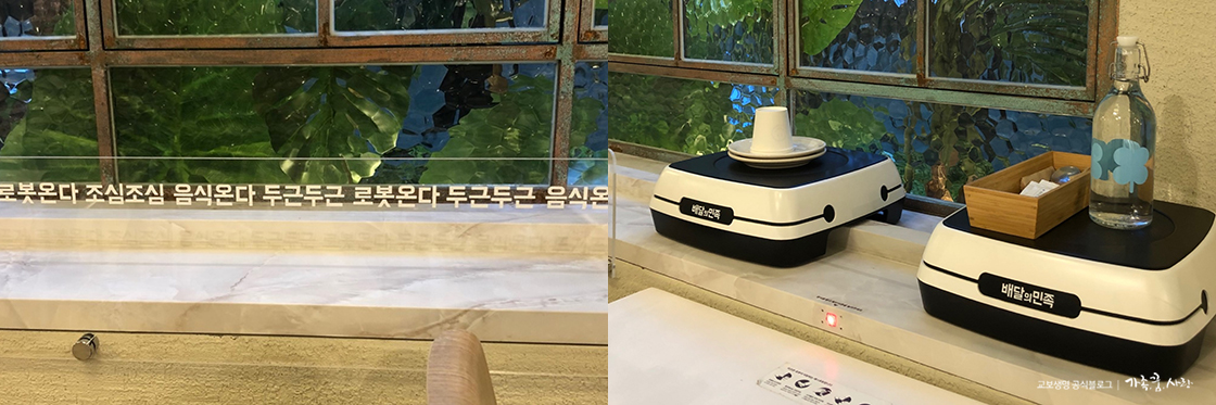 창가 쪽 좌석에 앉으면 큰 로봇 대신 레일을 달리는 작은 로봇이 서빙을 담당합니다. 로봇 위에 올려진 물과 식기, 음식 등을 내리고 확인 버튼을 누르면 로봇은 다시 주방으로 돌아가죠.