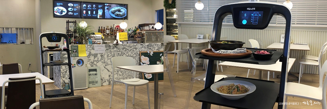 ‘메리고키친’은 배달의 민족 앱을 운영하는 우아한 형제들이 기술을 지원한 식당으로, 사람 대신 서빙 로봇 ‘딜리’가 음식을 서빙하는 것이 특징입니다. 식당의 규모가 큰 편임에도 불구하고 종업원이 한 명뿐이어서 무척 신기했어요.