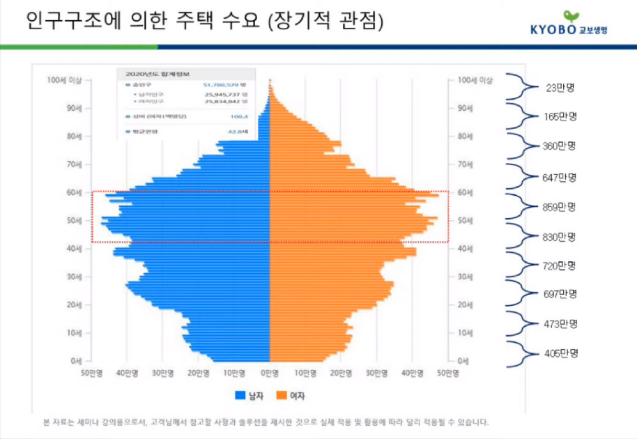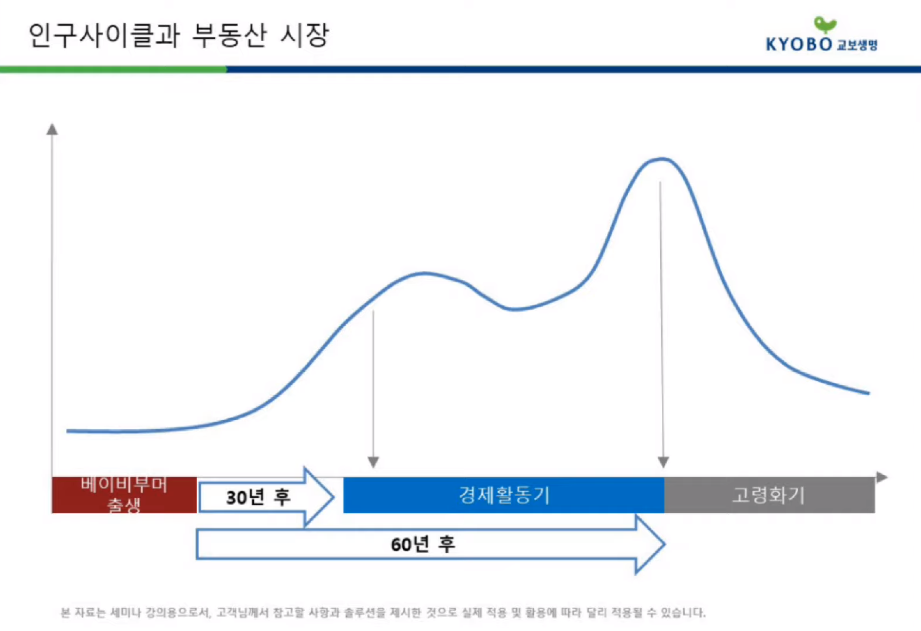 김계완 센터장의 강의에 따르면 부동산의 장기 사이클은 60년이라는 기간을 두고 움직인다고 해요. 많은 인구가 태어나는 베이비부머 시대에서 30년이 지나면 결혼을 하고 직장, 사업, 장사 등을 하며 집과 가게를 구매하는 경제활동기가 시작되는데요, 이후 다시 30년이 지나면 경제활동이 끝나는 시점이 되어 은퇴, 고령화 시대로 부동산 소비가 줄어든다고 합니다.