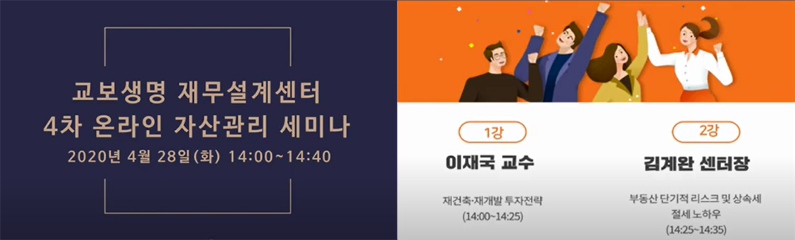 코로나19의 영향으로 경제불황이 계속되면서 노후와 자산관리에 대한 고민이 많으실 텐데요, 지난 4월 28일, 교보생명 재무설계센터에서 재건축·재개발 투자전략과 부동산 상속세 절세 노하우에 대한 세미나가 진행되어 제가 달려가 봤습니다. 알아 두면 돈이 되는 꿀 같은 정보들, 궁금하지 않으신가요? 지금부터 이날 강의의 핵심만 쏙쏙 골라 정리해 드릴게요!