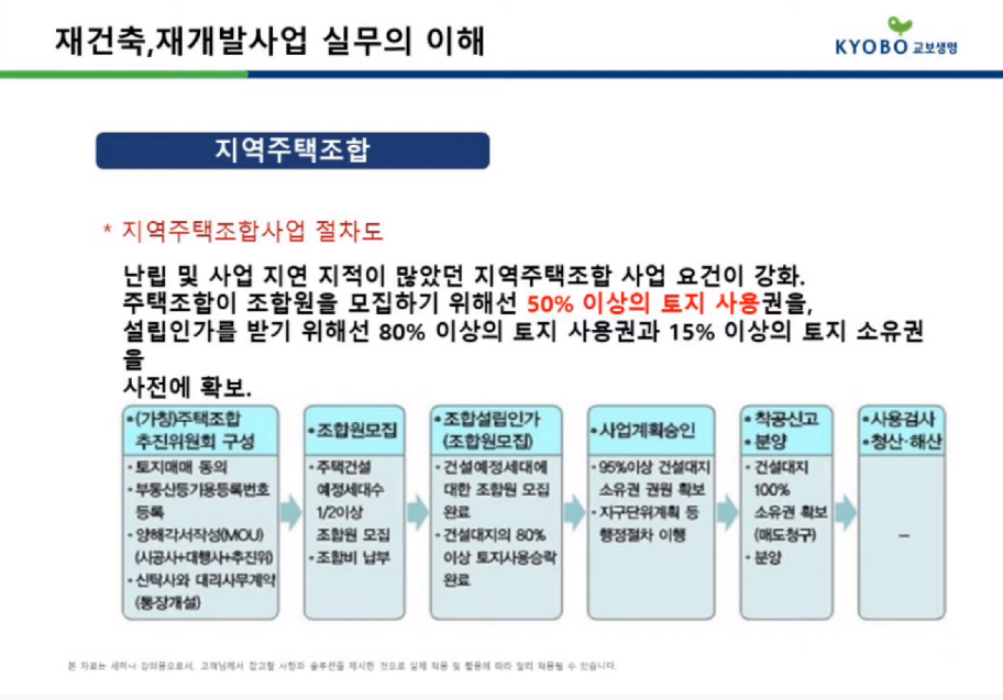 가장 빈번한 부동산 피해 사례 중 하나가 바로 지역주택조합인데요, 재건축, 재개발은 땅을 소유하고 있는 분들이 주체라면 지역주택조합은 토지를 하나도 가지고 있지 않은 상태에서 시행사가 토지의 일부를 가지고 조합원을 모집해 조합원들의 중도금과 계약금으로 토지를 구매하는 방식입니다. 어떻게 보면 바람직한 제도이기는 하나, 시행하는 주체의 자금력과 신뢰성이 떨어져 사업 지연, 추가 사업비가 많이 나오는 경우가 대부분이라고 해요. 따라서 되도록이면 가입하지 않는 것을 추천한다고 합니다.