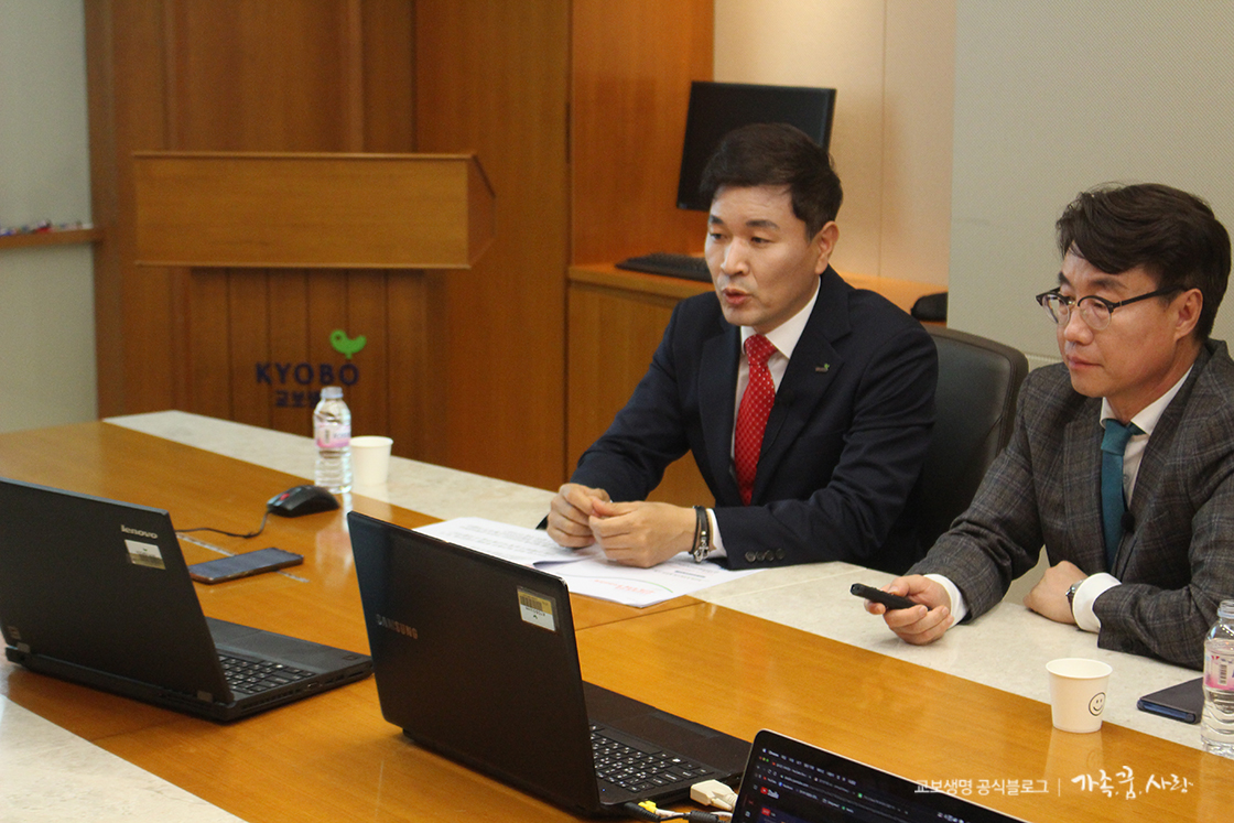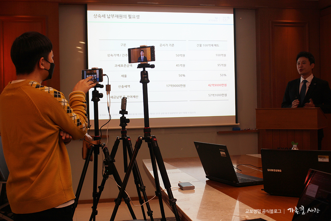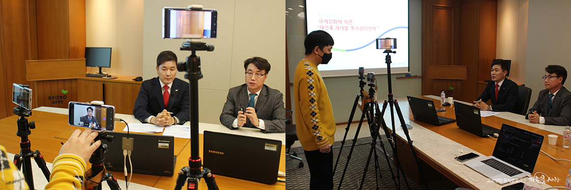 고객들에게 도움이 되고자 매월 유익한 주제로 진행되는 자산관리 세미나는 본래 오프라인으로 진행되는데, 최근에는 코로나19 사태로 인해 온라인으로 진행되고 있어요. 제가 취재를 간 날 1강에서는 이재국 교수의 재건축·재개발 투자전력 강의를, 2강에서는 김계완 센터장의 부동산의 단기적 리스크 및 상속세 절세 노하우에 대한 강의를 들을 수 있었습니다.