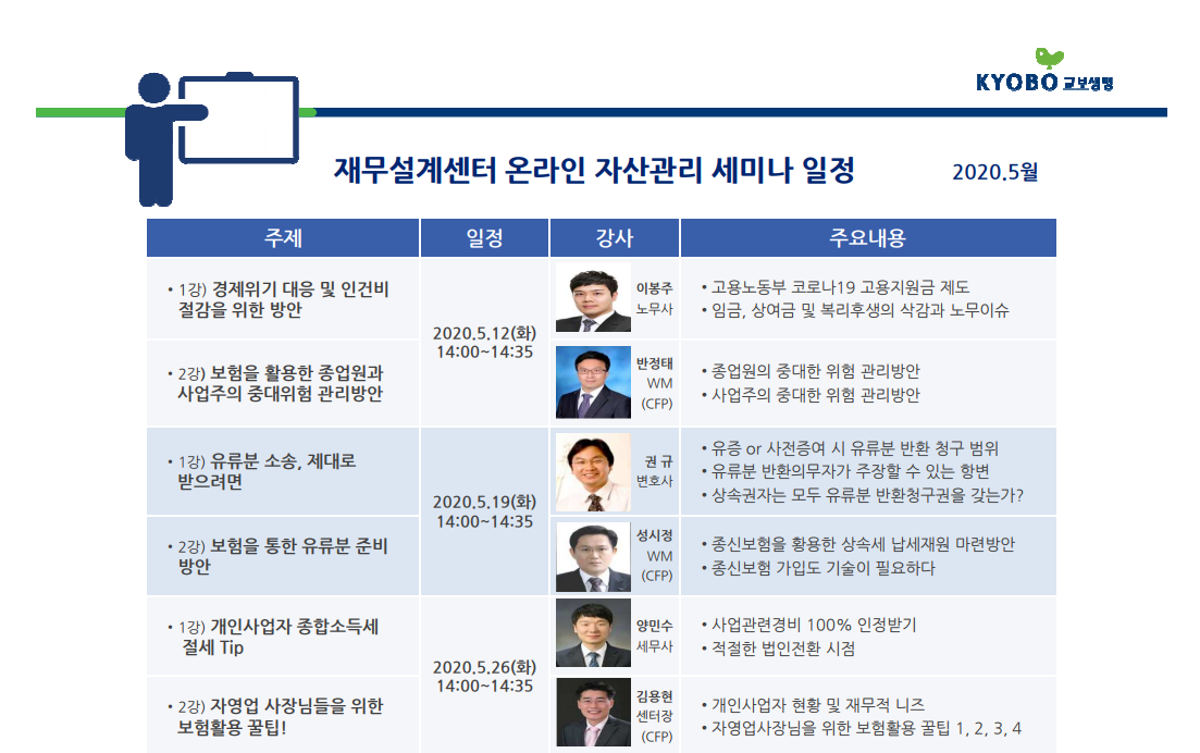교보생명에서는 5월에도 자산관리와 관련된 여러 주제로 온라인 세미나를 진행하는데요, 저처럼 평소 관심을 가지고 공부하고 싶으셨던 분들은 유튜브 교보생명 재무설계센터 채널을 통해(youtu.be/67rYaQAmj-4) 참석해 보시면 유익한 정보를 많이 얻으실 수 있을 거예요. 참석 고객 중 추첨을 통해 스타벅스 아메리카노를 증정하는 이벤트도 진행 중이니 놓치지 마세요!
