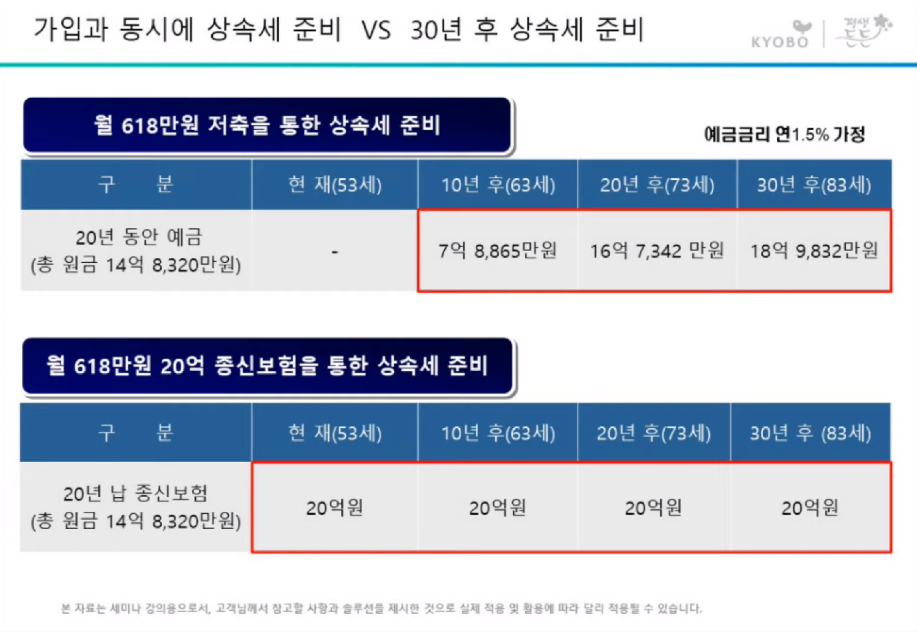 하지만 만약 갑작스럽게 상속이 개시된다면 어떻게 될까요? 상속자가 상속세를 마련하기 위해 부동산을 매도하면 매도 가격을 기준으로 상속세를 내게 되고, 대출을 받으면 감정평가가 들어가기 때문에 감정평가 금액이 상속세 계산에 반영됩니다. 따라서 상속세를 낼 20억 정도는 언제든지 준비가 되어 있어야 가족에게 안전한 상속이 이루어진다는 것을 알 수 있죠. 저축을 통한 금액과 종신보험을 통한 금액을 비교해 보면, 상속세 마련을 위해서는 종신보험에 가입하는 것이 훨씬 효과적이라는 것을 알 수 있습니다. 많은 자산가들이 종신보험에 가입하는 이유입니다.
