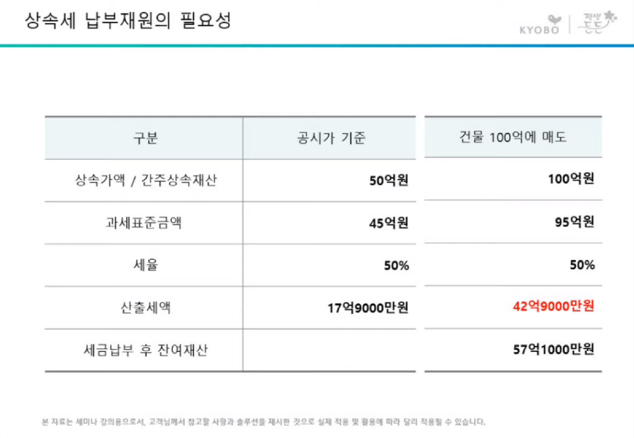 하지만 만약 갑작스럽게 상속이 개시된다면 어떻게 될까요? 상속자가 상속세를 마련하기 위해 부동산을 매도하면 매도 가격을 기준으로 상속세를 내게 되고, 대출을 받으면 감정평가가 들어가기 때문에 감정평가 금액이 상속세 계산에 반영됩니다. 따라서 상속세를 낼 20억 정도는 언제든지 준비가 되어 있어야 가족에게 안전한 상속이 이루어진다는 것을 알 수 있죠. 저축을 통한 금액과 종신보험을 통한 금액을 비교해 보면, 상속세 마련을 위해서는 종신보험에 가입하는 것이 훨씬 효과적이라는 것을 알 수 있습니다. 많은 자산가들이 종신보험에 가입하는 이유입니다.