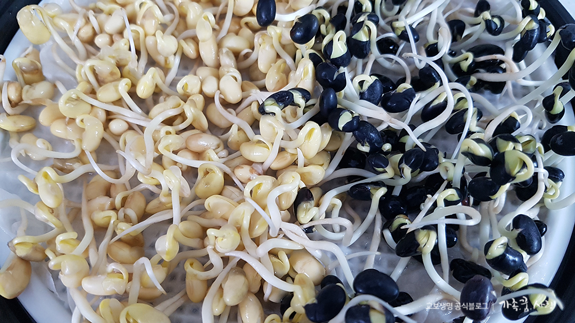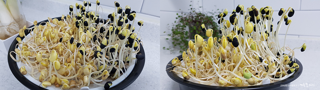 콩나물 수경재배 3일차와 4일차의 모습입니다. 검은콩의 성장 속도가 노란콩보다 훨씬 빠르더라고요. 노란 콩나물은 검은 콩나물의 절반 정도 되었어요. 4일차 되던 날에는 검은 콩나물 때문에 뚜껑이 잘 닫히지 않아 검은 콩나물을 먼저 수확했습니다. 키가 대략 14cm 정도로 쑥쑥 자란 상태였어요. 노란 콩나물은 좀 더 길러 보기로 했습니다.