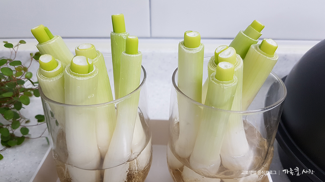 저는 집에 있는 투명한 유리컵에 절단한 대파 뿌리 부분을 넣어 주었어요. 안이 보여야 대파 상태를 쉽게 관찰할 수 있습니다. 대파를 재배할 때에는 물을 자주 갈아 주셔야 해요. 그렇지 않으면 파가 썩는 듯한 고약한 냄새가 날 수 있습니다.