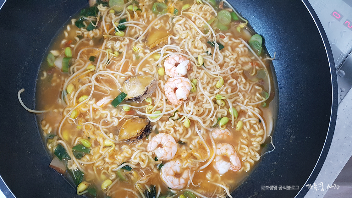 어떤 요리를 해 볼까 고민하다 아이들이 좋아하는 콩나물 라면을 해먹었습니다. 냉장고에서 잠자고 있던 미니 전복과 새우, 대파도 듬뿍 넣어서 시원한 콩나물 라면을 끓였더니 아이들이 순삭해 버렸어요. 직접 키운 콩나물이 들어가서인지, 더 담백하고 맛있게 느껴졌습니다.