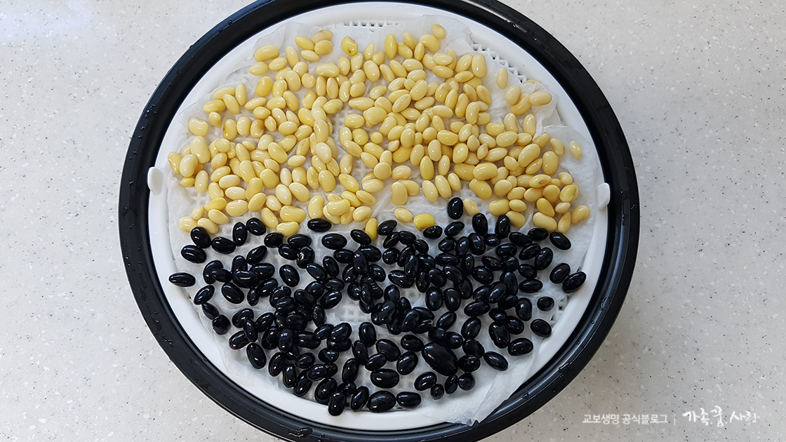 콩나물 콩과 재배기가 준비되었으니, 이제 본격적으로 콩을 물에 불려 볼까요? 설명서에는 실내온도 16~20℃에서 3~4시간 미지근한 물에 불려 주라고 나와 있는데요, 제가 직접 길러 보니 한나절 이상 불려 주면 발아가 더 잘 되는 것 같았어요. 잘 불려진 콩을 자세히 살펴보면 금방이라도 싹이 튀어나올 것만 같은 느낌이 듭니다.