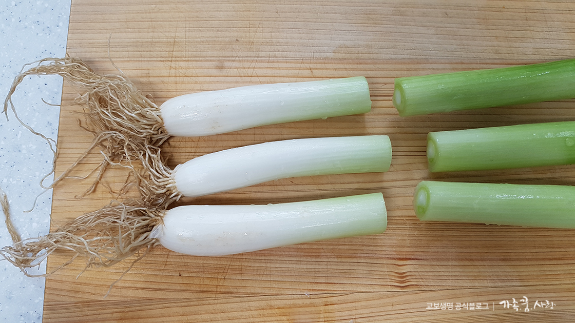 먼저 대파 뿌리 부분에 묻어 있는 흙을 털어내고, 줄기 부분과 잎 부분도 깨끗하게 세척해 줍니다. 세척 후 끝 부분을 대략 10cm 정도를 남기고 잘라 주세요. 수경 재배할 용기 사이즈에 맞게 적당한 길이로 잘라 주시면 됩니다.