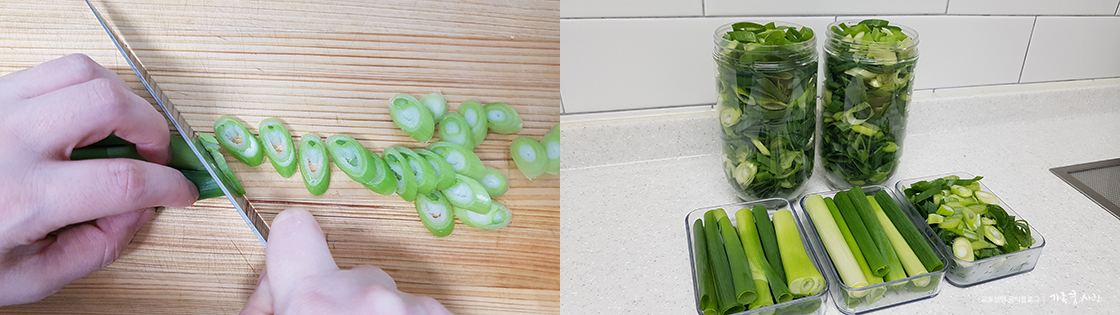 어슷썰기로 썬 대파는 냉동실에 보관해 두었다가 국이나 탕 요리에 양념으로 사용하시면 되고, 국물 우려내는 용도나 각종 무침 용에 쓰이는 대파는 용기 길이에 맞게 썰어서 냉장 보관합니다. 밀폐용기 바닥에 키친타월을 깔아주면 대파가 물러지는 것을 방지하고 더 오래 싱싱하게 보관할 수 있어요.